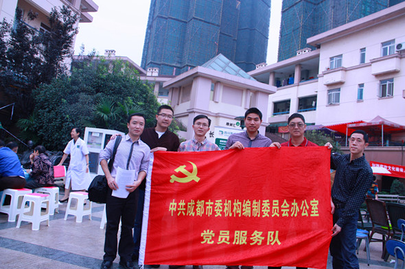 国庆佳节前夕,市委编办第三支部全体党员干部赴锦江区万科城市花园社区开展“党员义工日”活动,并与社区居民一同观看社区组织的庆祝国庆文艺汇演。